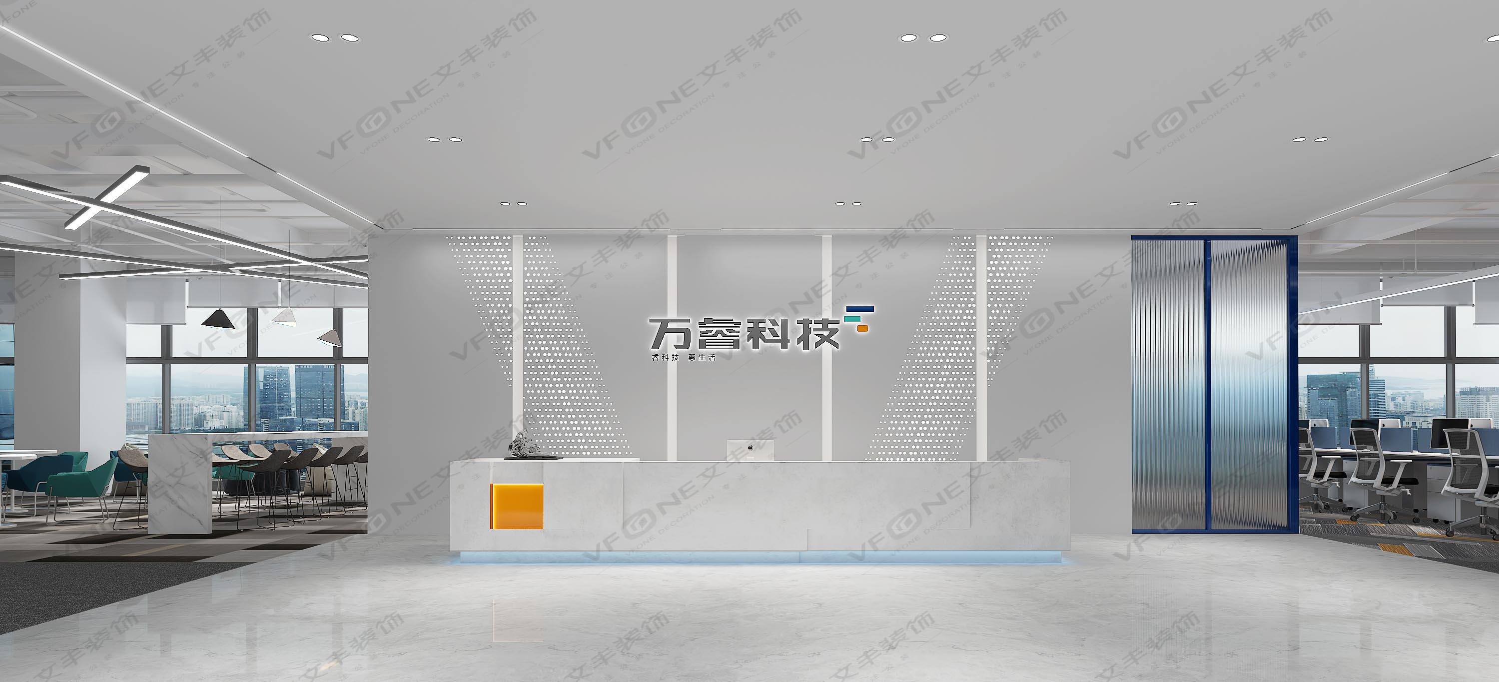 以萬睿企業(yè)文化從前廳到辦公區(qū)設(shè)計以高端科技為主,大前廳以內(nèi)嵌氛圍線條燈展示,以槍灰色瓷磚和大理石瓷磚融合,前廳主打色以端莊、成熟為主!右側(cè)砌墻隔斷方便接待客戶洽談為主要作用,在了解萬睿企業(yè)文化從中提取出 元素作為整個空間的主要裝修材料,為了凸顯他的科技企業(yè)的身份,文豐用不同的色彩在不同的功能區(qū)表達(dá)不一樣視覺感,讓前廳和辦公區(qū)擁有更多不同的主題設(shè)計。