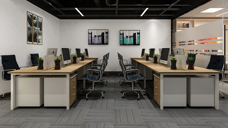 開放辦公區(qū)設(shè)計充分考慮功能空間的人員流動性、便捷性與舒適性,并適當?shù)牧舭卓臻g,多樣式綠植、淺灰色條紋地毯、黑色樸素吊頂、白色的柱子和燈帶相互映襯,素雅、簡約、大氣。洽談區(qū)與開放辦公區(qū)的設(shè)計形成呼應(yīng),增加了空間的對比和張力。