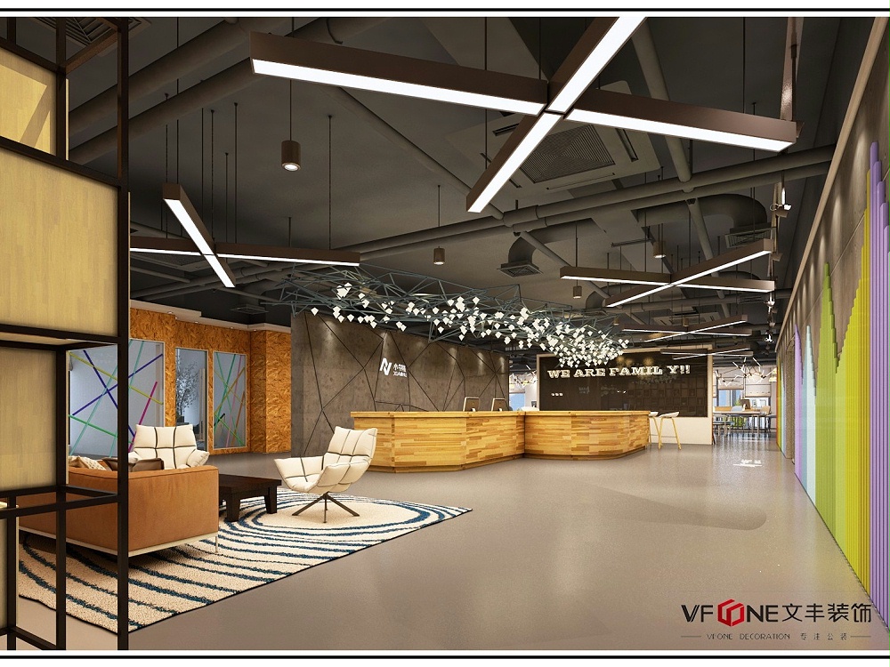 前廳的燈飾和木制前臺(tái)的搭配,如此創(chuàng)新的前臺(tái)裝飾,不像印象中前臺(tái)一樣過于嚴(yán)肅,創(chuàng)新中兼具個(gè)性和開放性,多功能區(qū)域兼具辦公、會(huì)議、休息的功能,使用彩色軟裝、圖案去搭配,中和黑白灰的冰冷感,壁掛設(shè)計(jì)了清新的綠植,給接待區(qū)增添了活力,青春和前衛(wèi)的氣息濃郁,紅色沙發(fā)增添一些亮色。