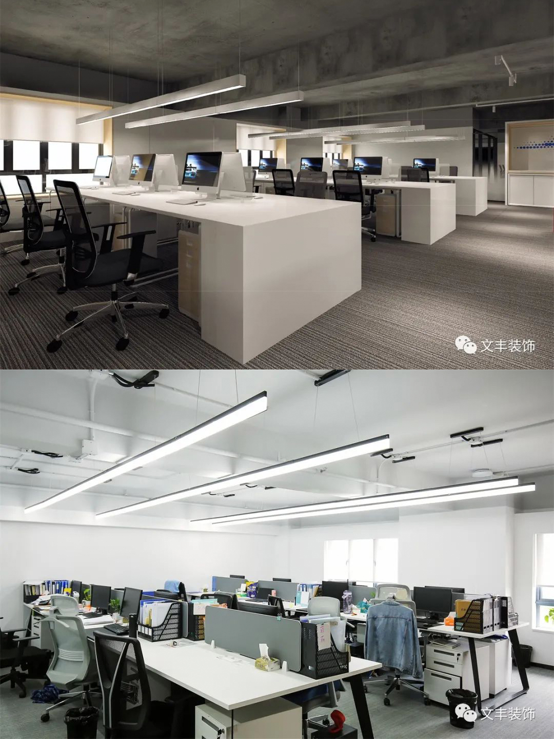 辦公區(qū)位于二層閣樓內(nèi),層高較低,為避免因壓抑而影響員工的工作狀態(tài)。  辦公區(qū)墻面整體刷白,搭配條形燈帶,使得整體空間在視覺上明亮而開闊。